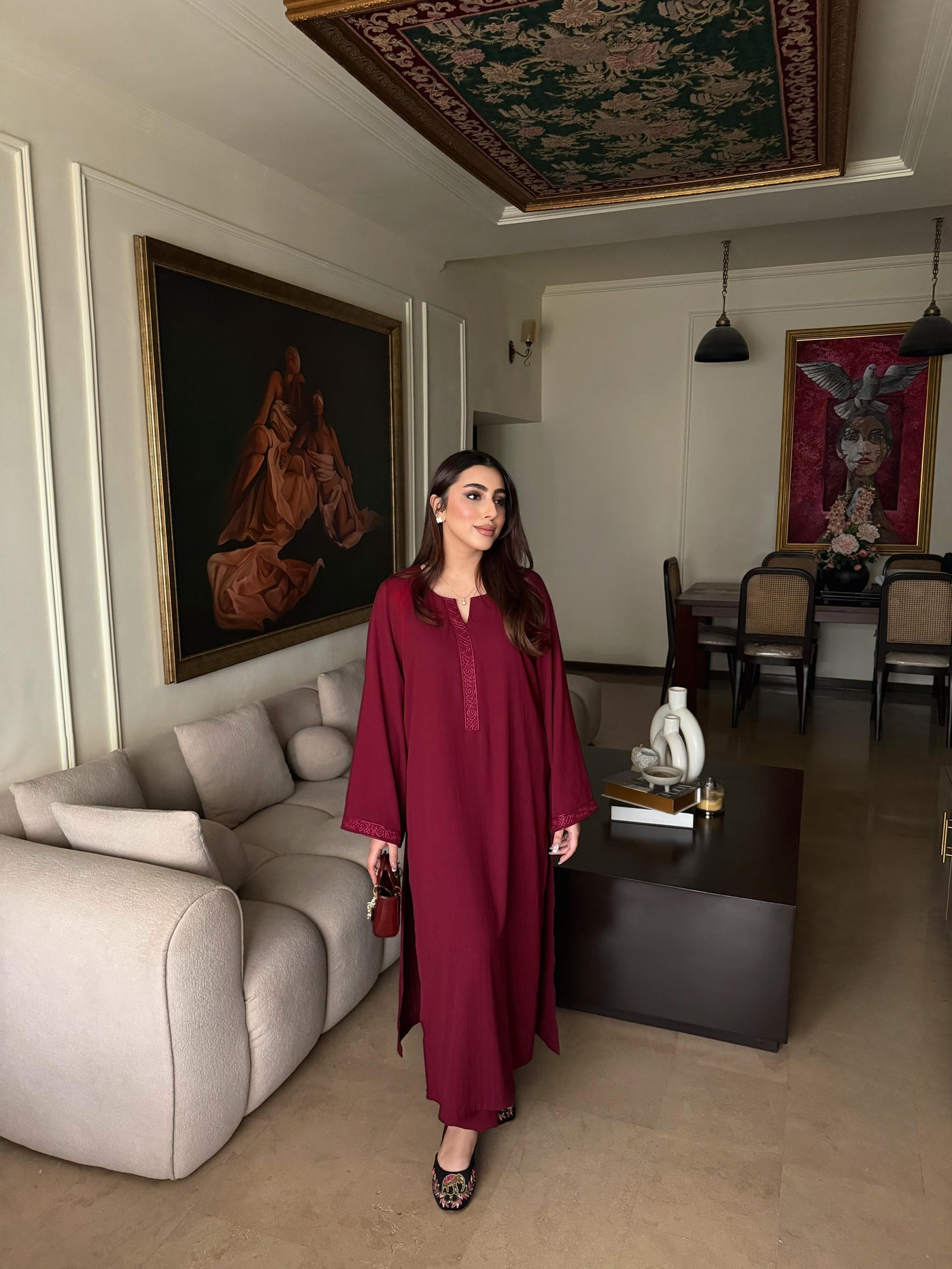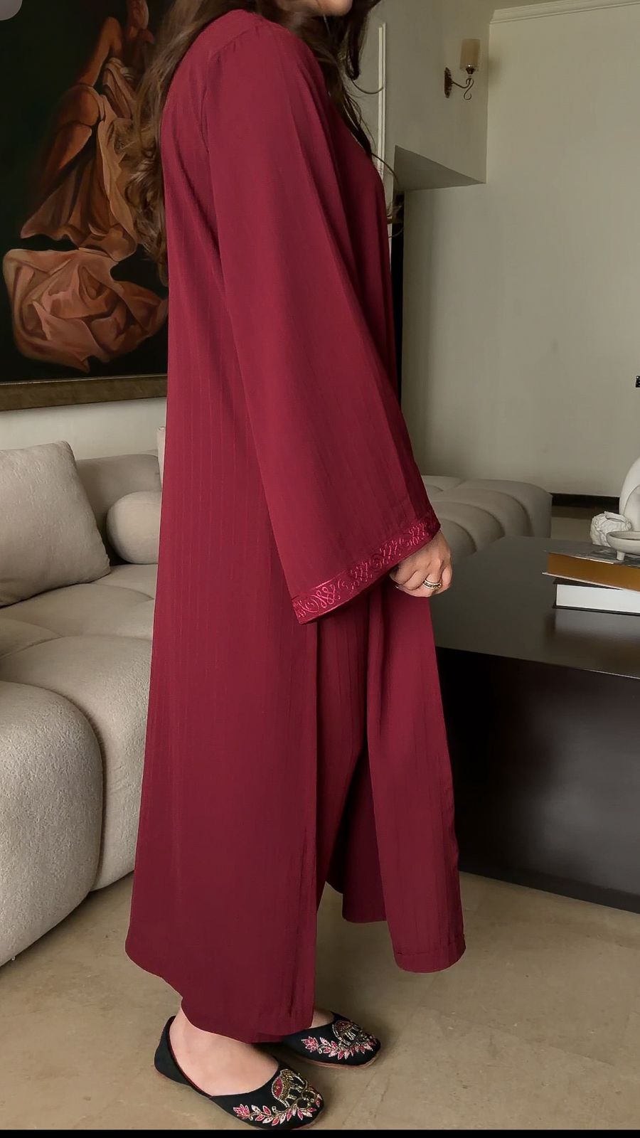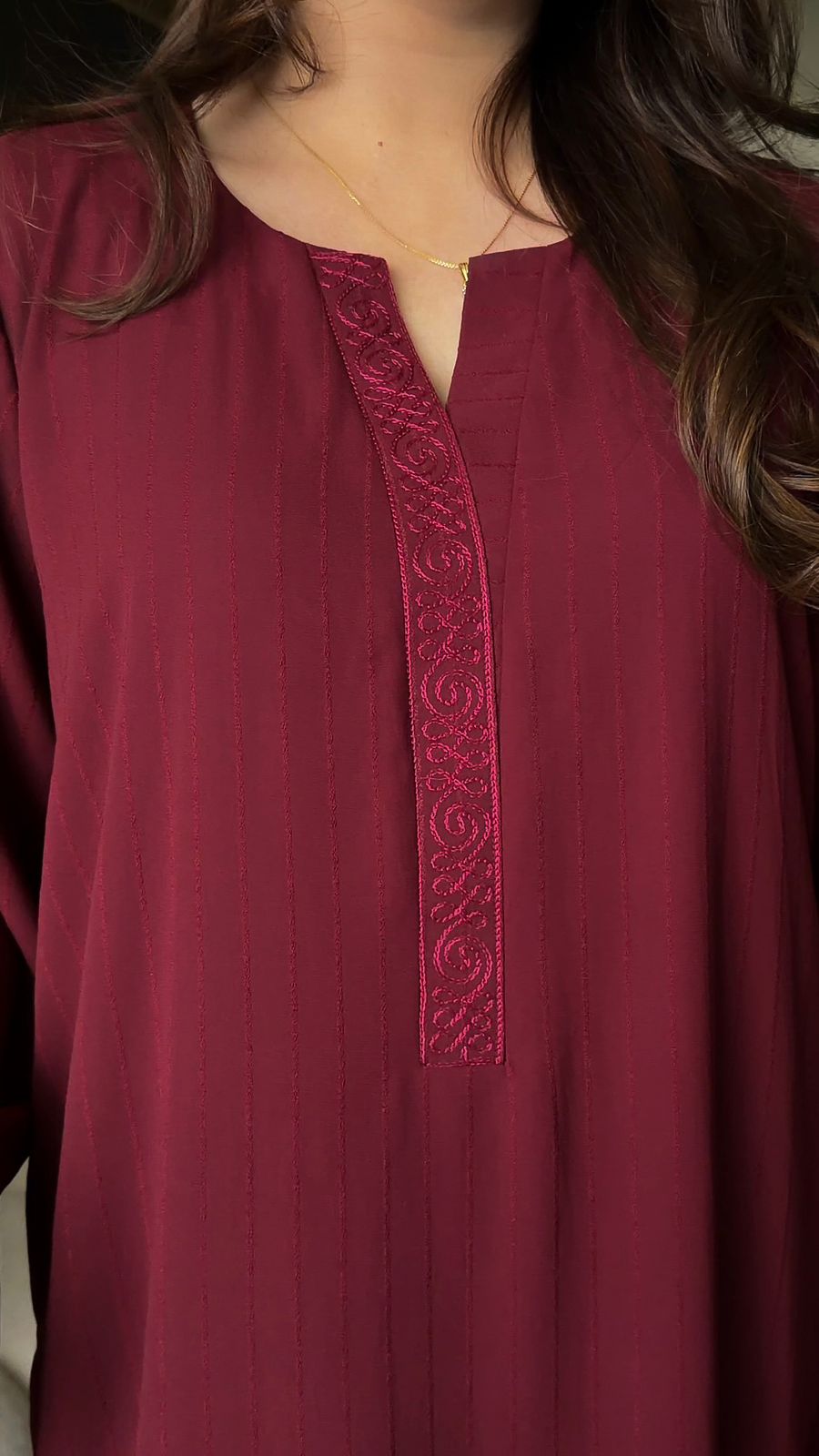 This dress offers a unique, subtle linear detail that adds depth and luxury to the fabric without being overpowering. The material is lightweight, breathable, and drapes beautifully, making it perfect for all-day wear.
