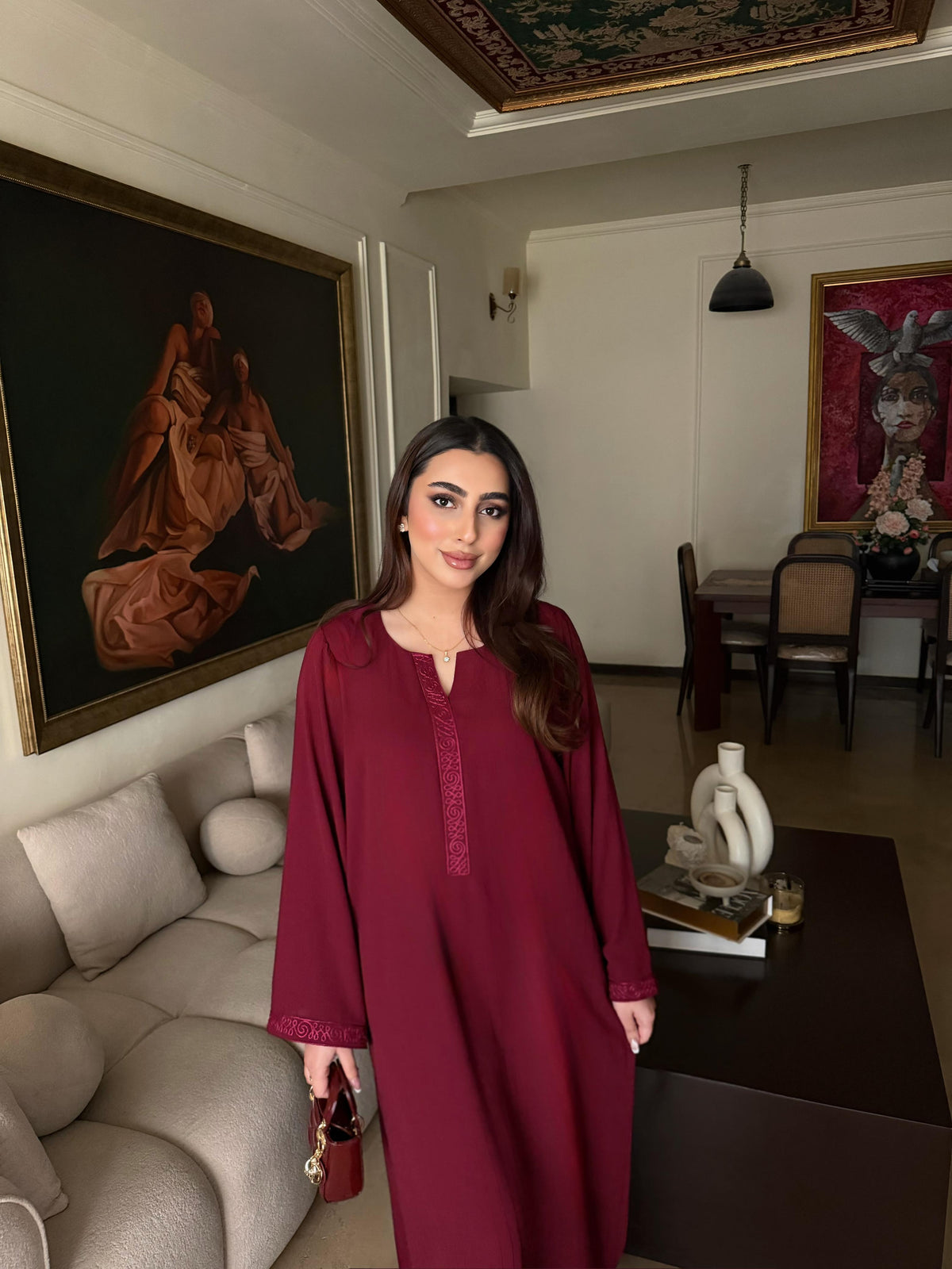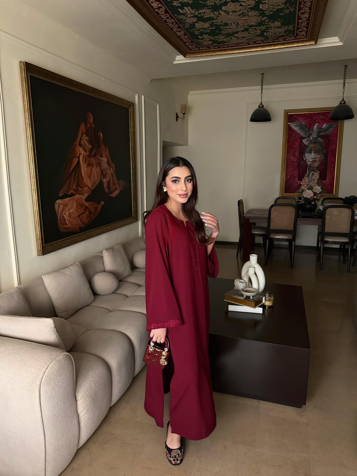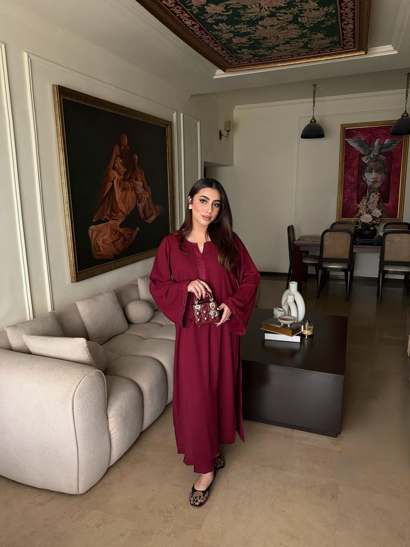 This dress offers a unique, subtle linear detail that adds depth and luxury to the fabric without being overpowering. The material is lightweight, breathable, and drapes beautifully, making it perfect for all-day wear.