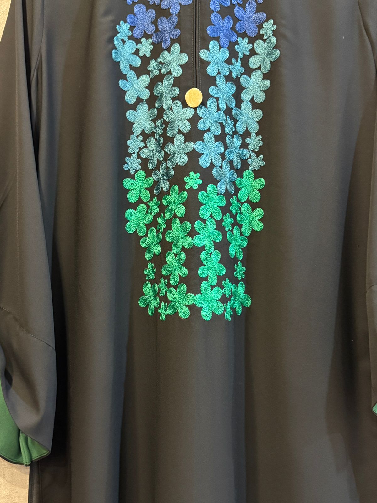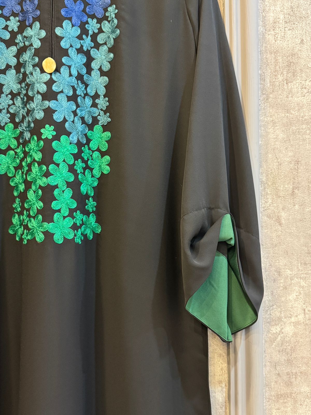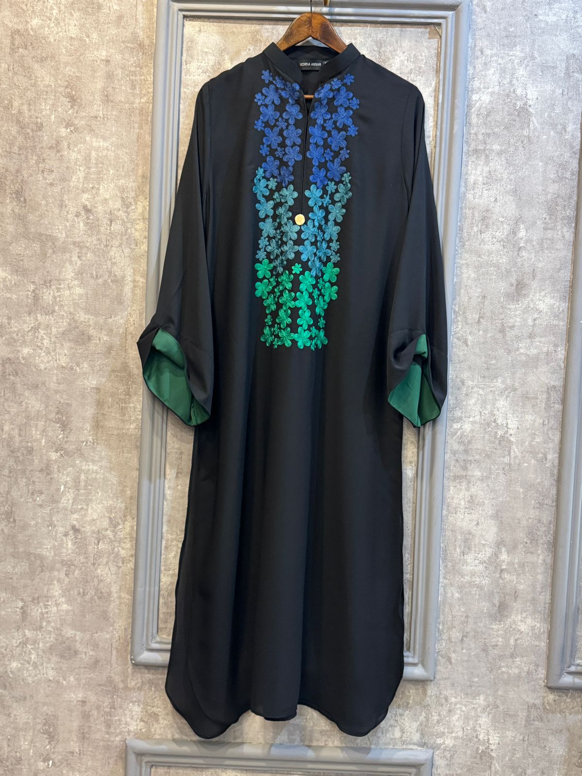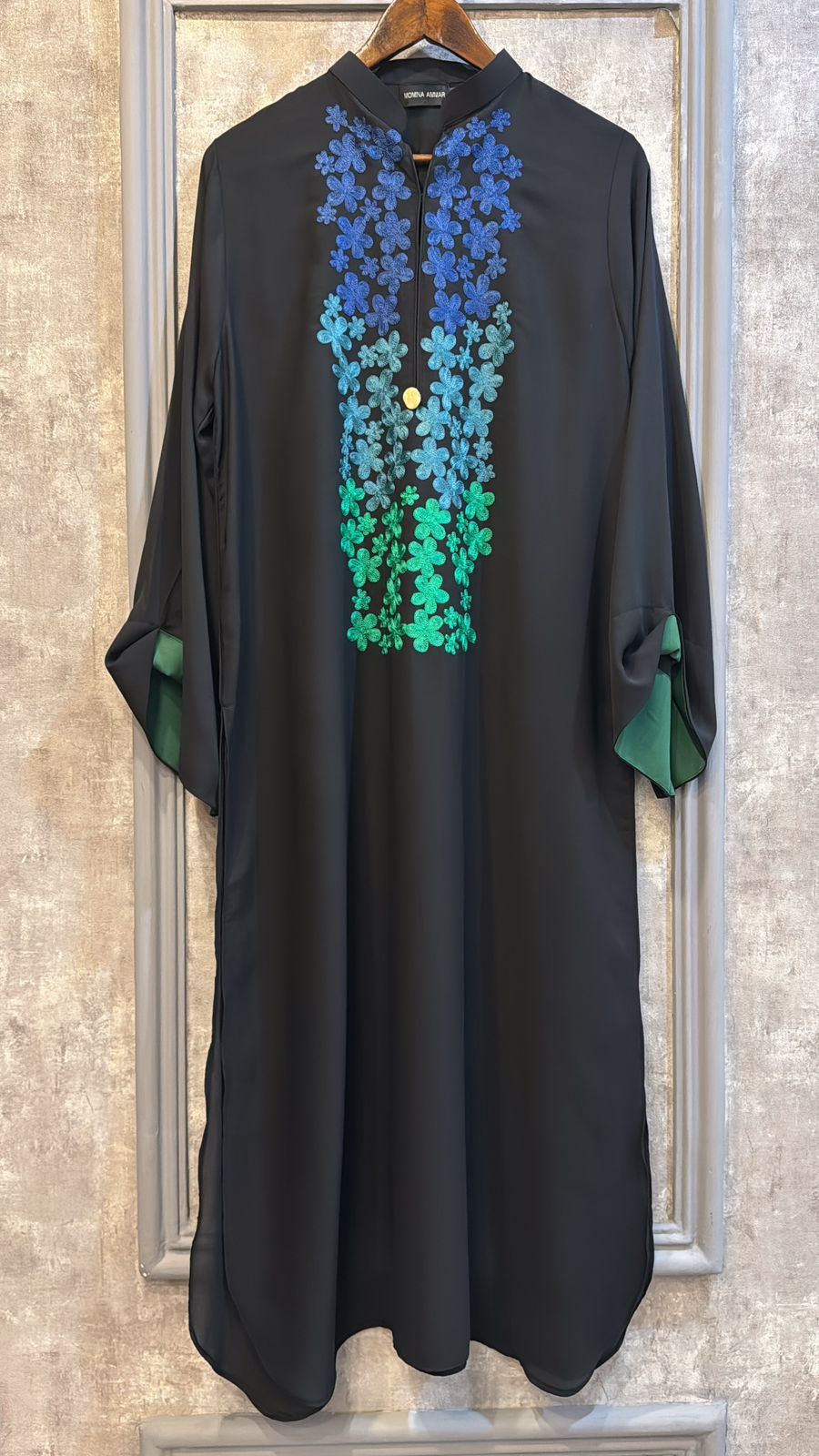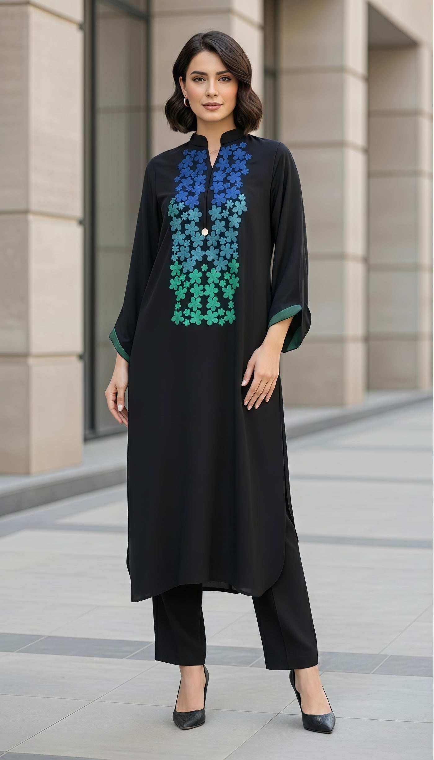 Immerse yourself in the earthy sophistication of our latest arrival. This stunning piece is crafted from premium, flowy Georgette fabric that offers both comfort and a flattering drape. The black canvas is brought to life with intricate, high-contrast Ari embroidery in ice hues, cascading down the neckline in a traditional yet contemporary pattern.