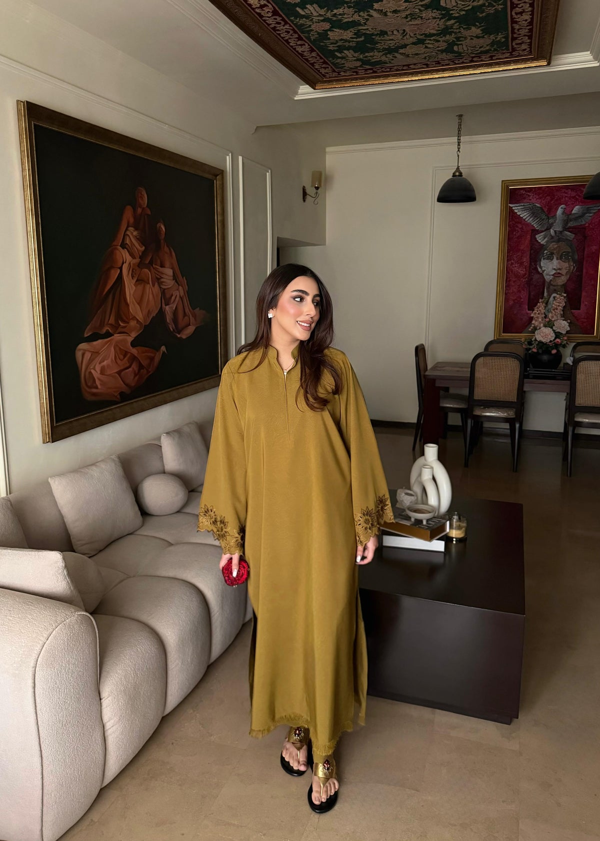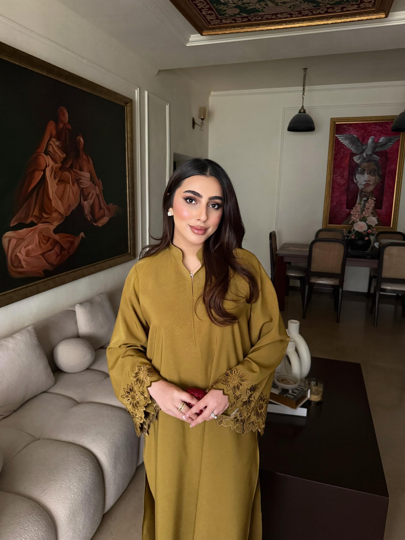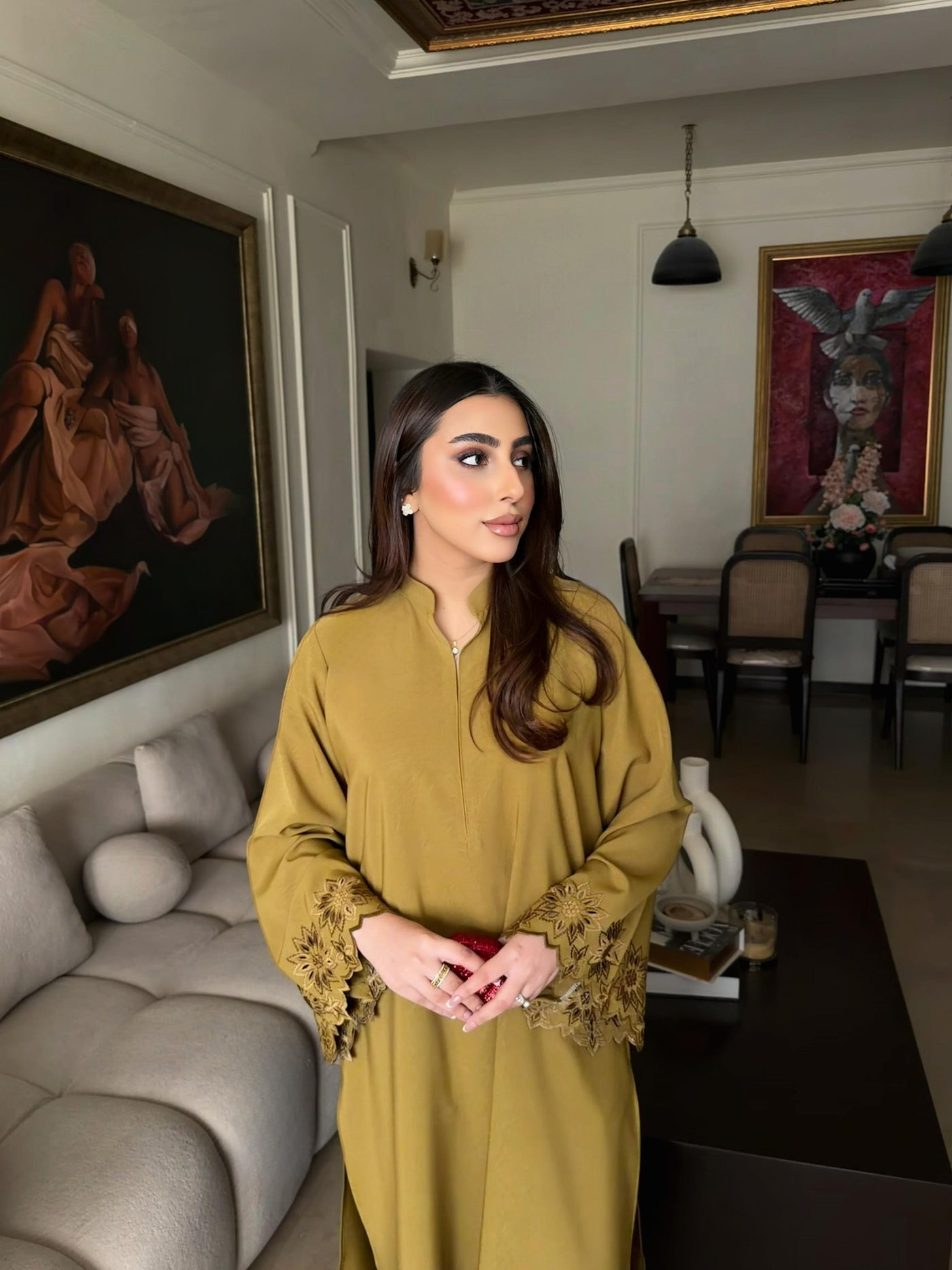 The design features intricate, high-quality embroidery on the sleeves, beautifully complemented by delicate threadwork across the shirt for a touch of timeless elegance. Designed for the modern woman who values both comfort and class, this piece is a versatile wardrobe essential.