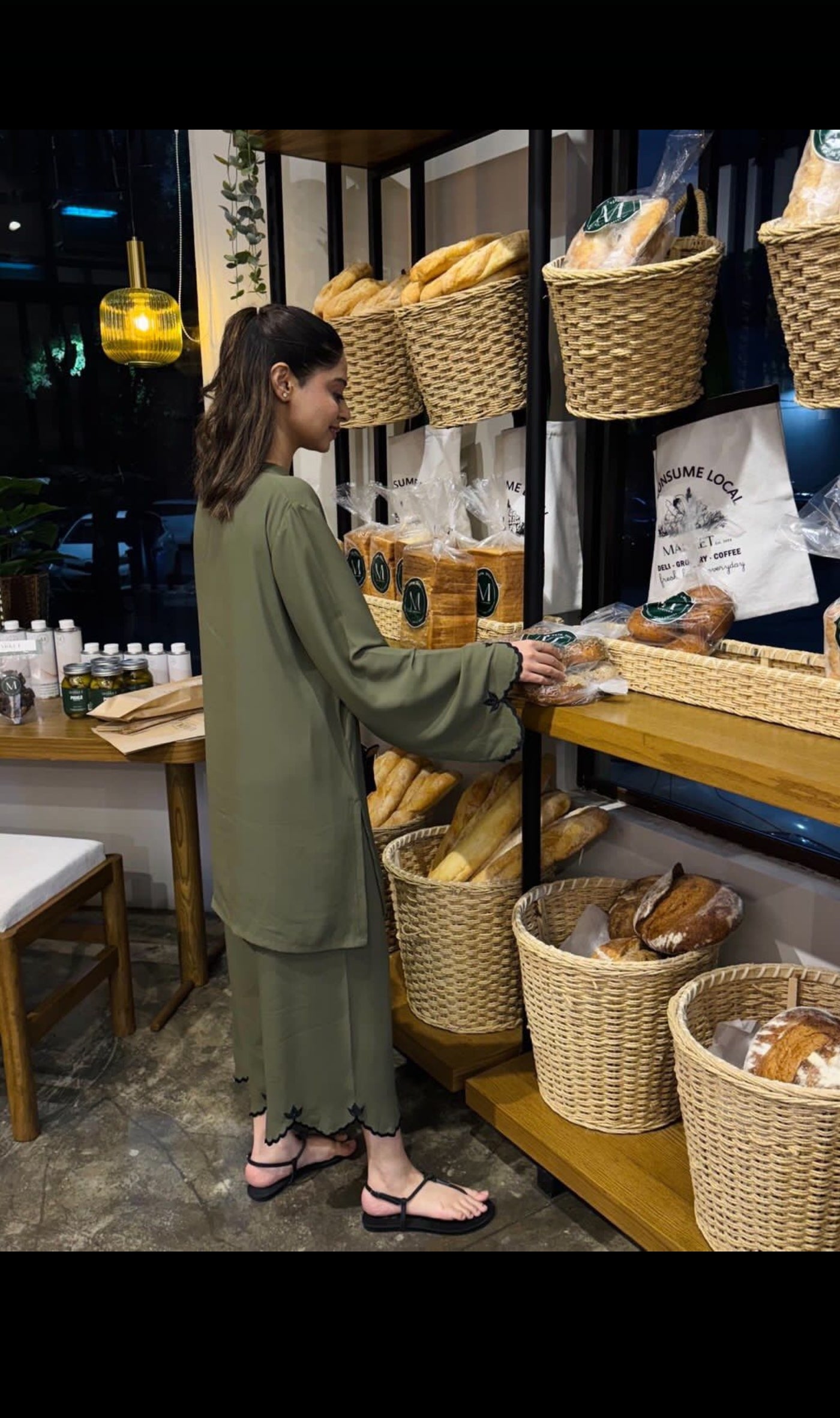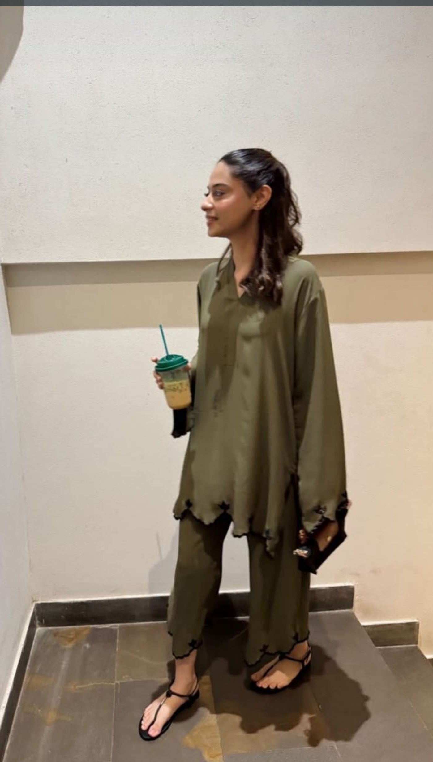Beautiful fusion of colour, scallop embroidery on shirt with embroidery pants